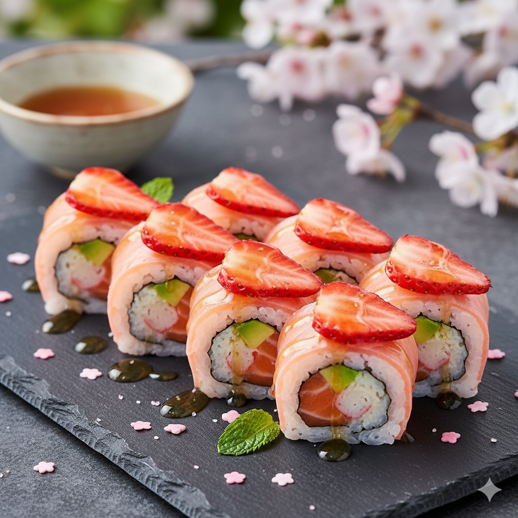 A vibrant celebration of spring — fresh salmon, avocado, and crab wrapped in soy paper, topped with strawberry slices and a drizzle of yuzu honey glaze.