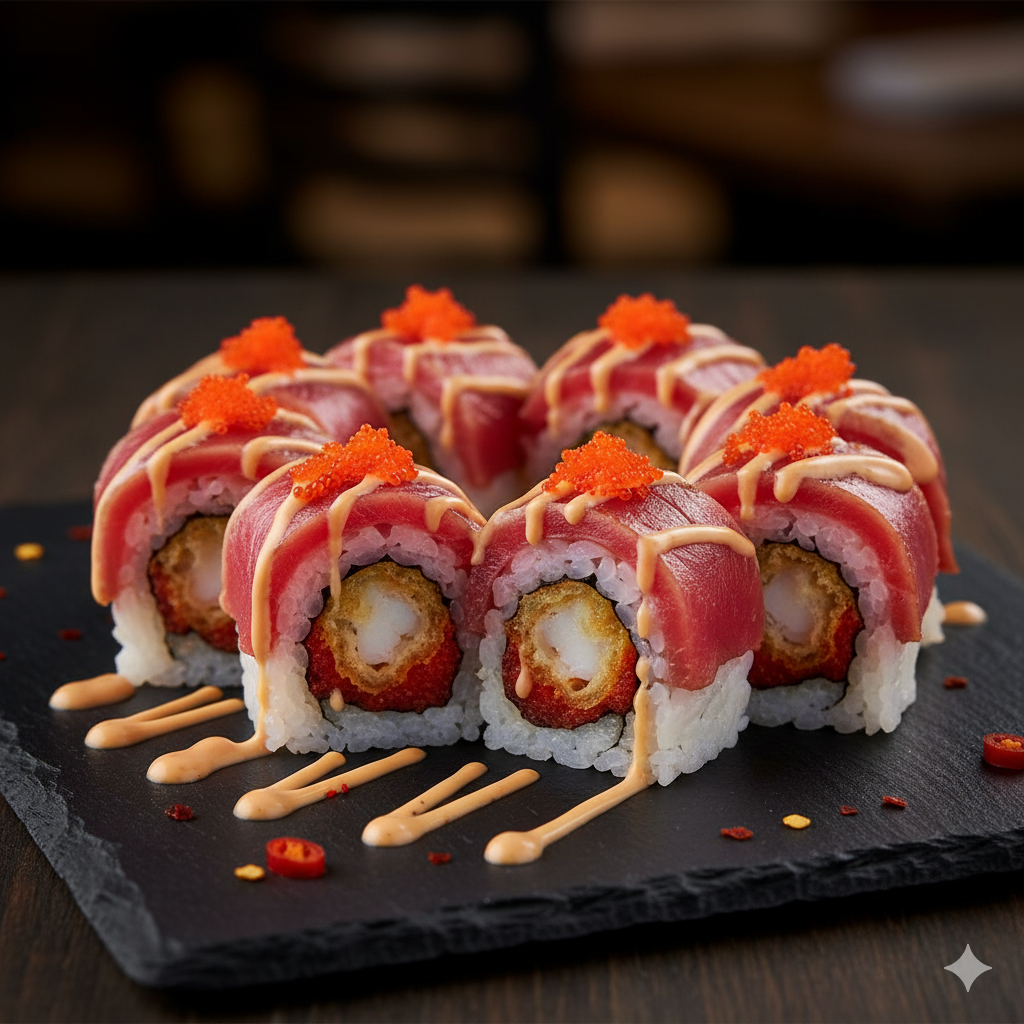 Tempura shrimp and spicy tuna inside, layered with seared ahi, tobiko, and a touch of sweet chili aioli for a bold, fiery finish.