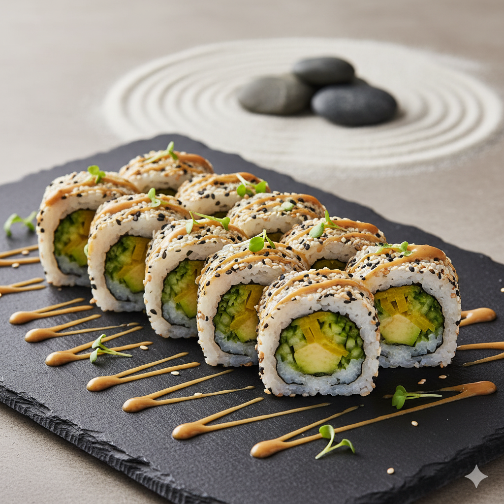 A vegetarian masterpiece with cucumber, avocado, asparagus, and pickled daikon — finished with sesame seeds and a light miso glaze.