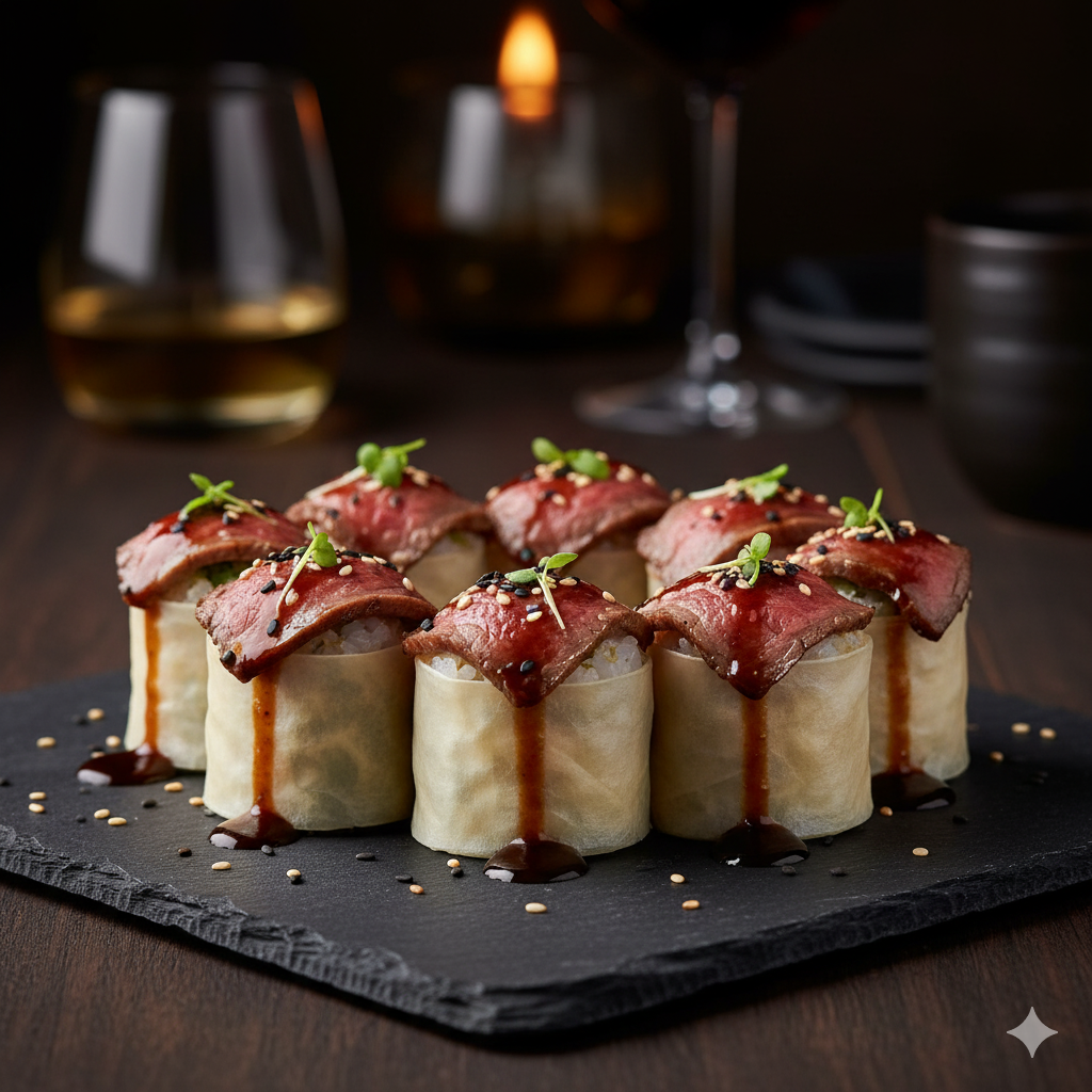 Crab mix and cucumber rolled in soy paper, topped with wagyu slices and truffle ponzu — the ultimate fusion of flavor and luxury.