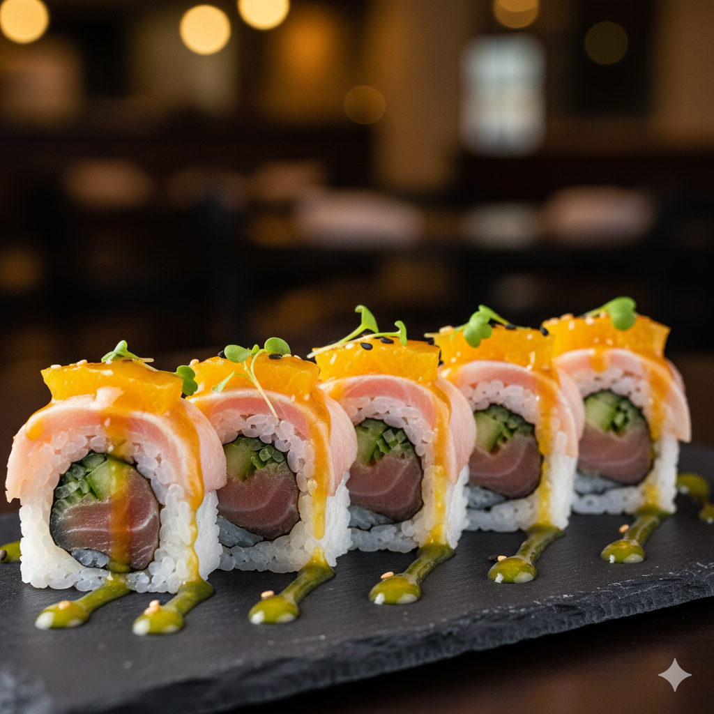 Fresh albacore, cucumber, and orange slices drizzled with yuzu citrus glaze — a perfect balance of bright flavor and delicate texture.